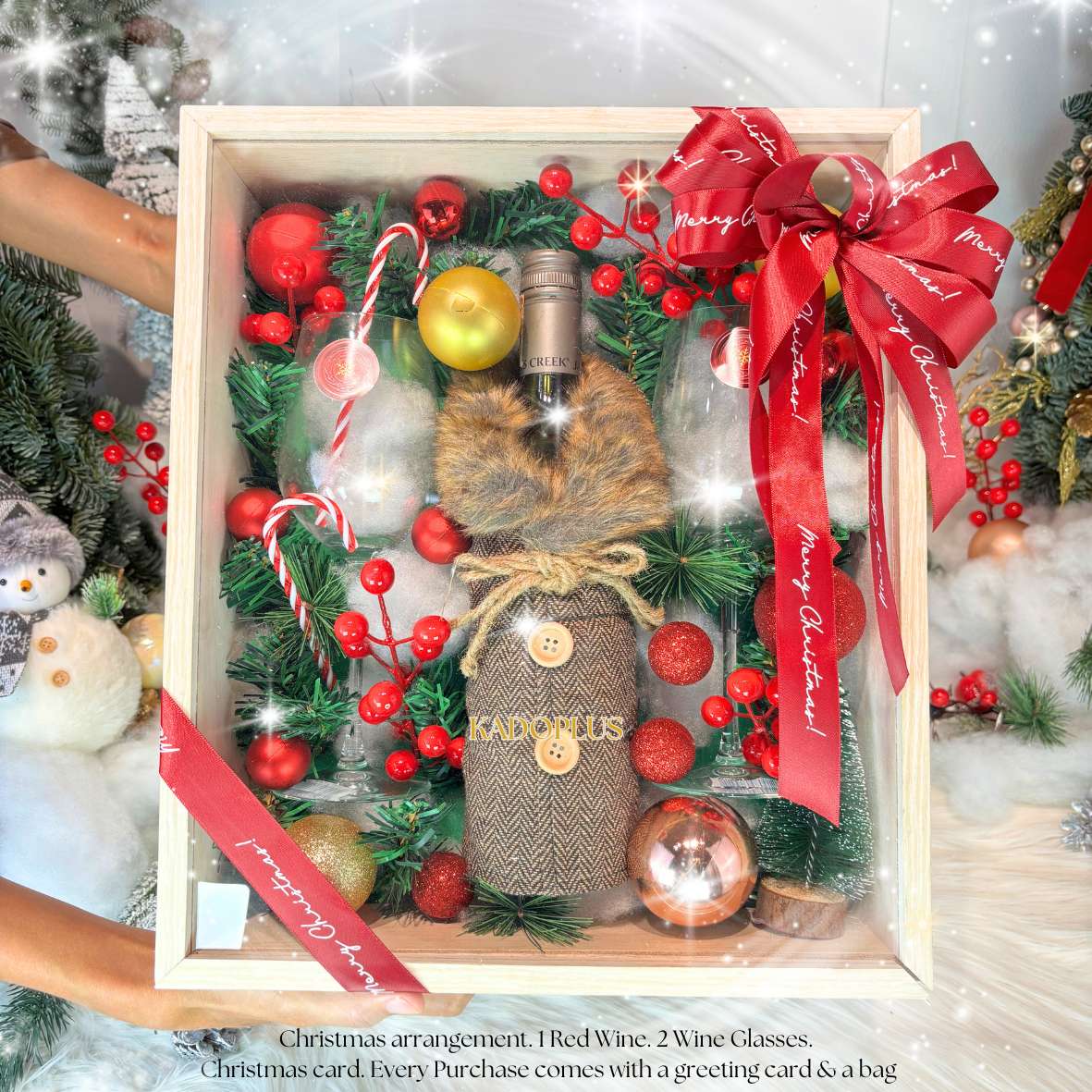Artificial Christmas arrangement with Christmas decorations with Cabernet Sauv and 2 wine glasses.